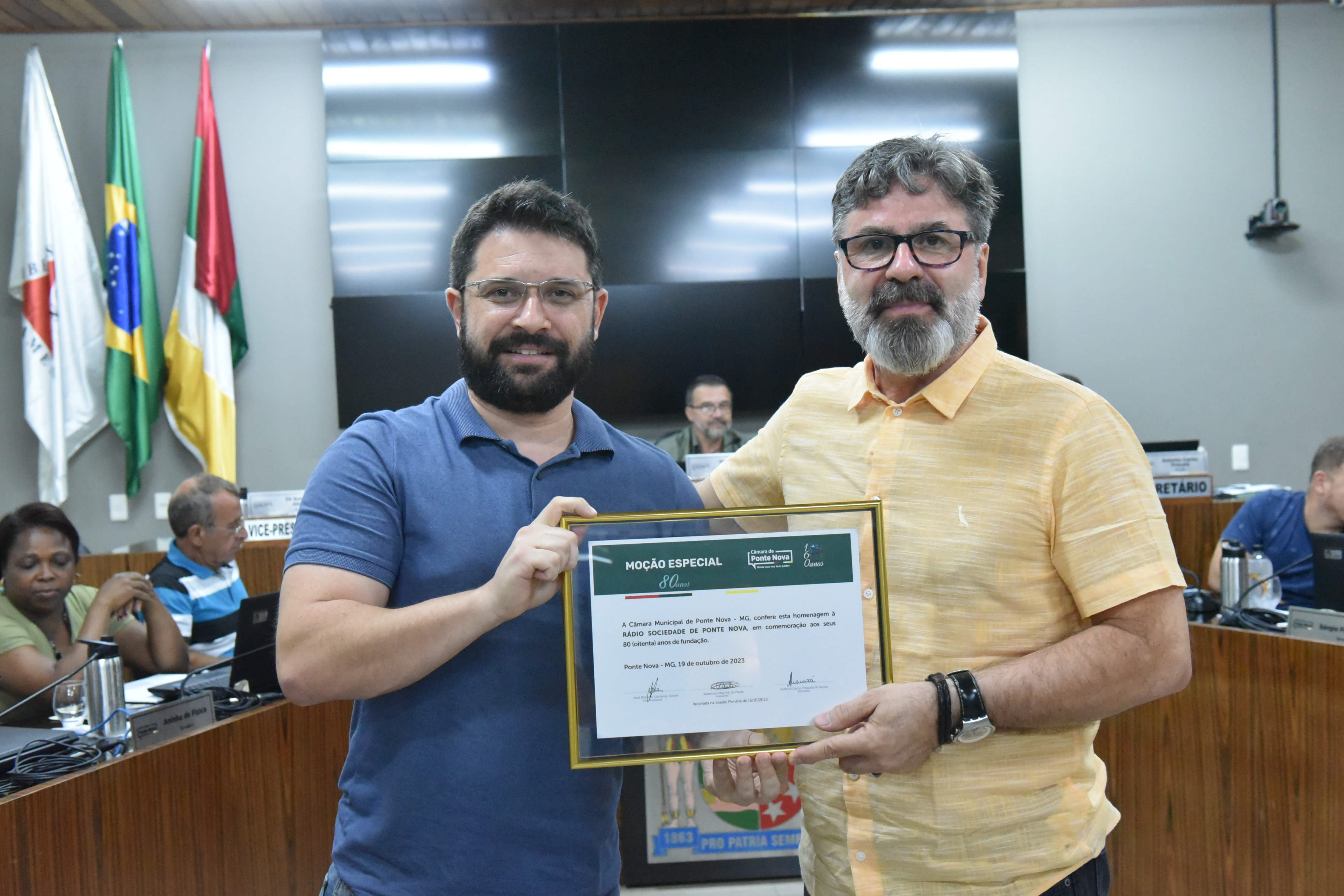O representante da Rádio Sociedade de Ponte Nova, Sérgio Marques Cordeiro, recebeu a placa em alusão aos 80 anos de Instituição. “Ficamos muito felizes com isso, e agradecemos a cada um dos senhores vereadores e vereadoras por essa distinção. [...] O rádio, no Brasil, comemorou ano passado 100 anos. Então Ponte Nova, 20 anos depois, quando a tecnologia não andava tão rápido assim, ela já estava inaugurando uma emissora de rádio”.